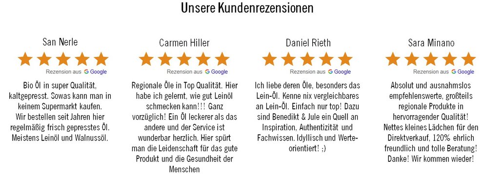 Wir sind Jule und Benedikt aus dem schönen Mittelfranken. In unserer Ölmanufaktur erzeugen wir seit 2018 mit Leidenschaft, Erfahrung und echter Handarbeit einzigartige Naturprodukte von höchster Qualität.